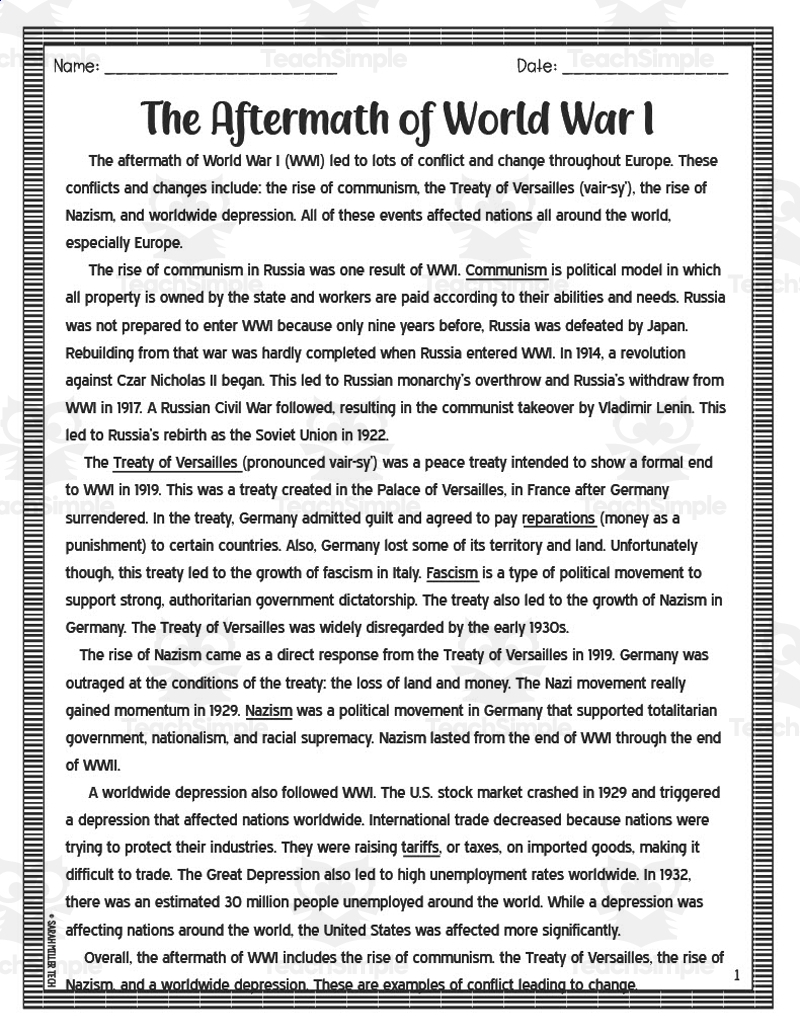 Aftermath Of World War I Reading Packet By Teach Simple