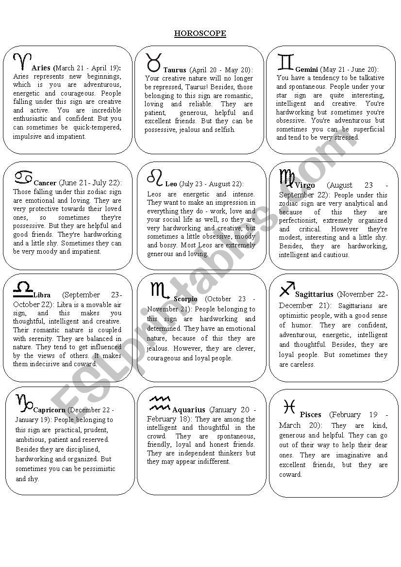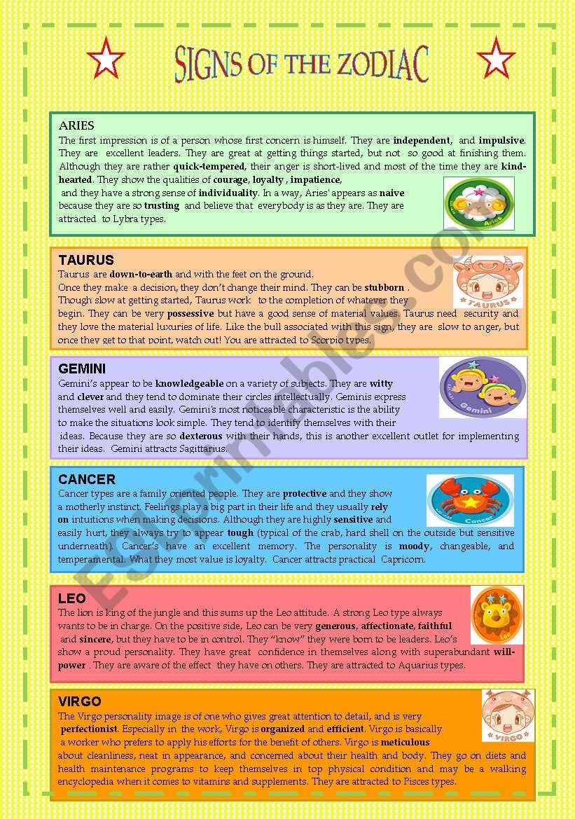 Not only will these worksheets help improve reading comprehension, but they will also introduce your students to the unique characteristics and traits associated with each zodiac sign. This can lead to discussions about personality traits, strengths, and weaknesses, fostering a deeper understanding of themselves and others.